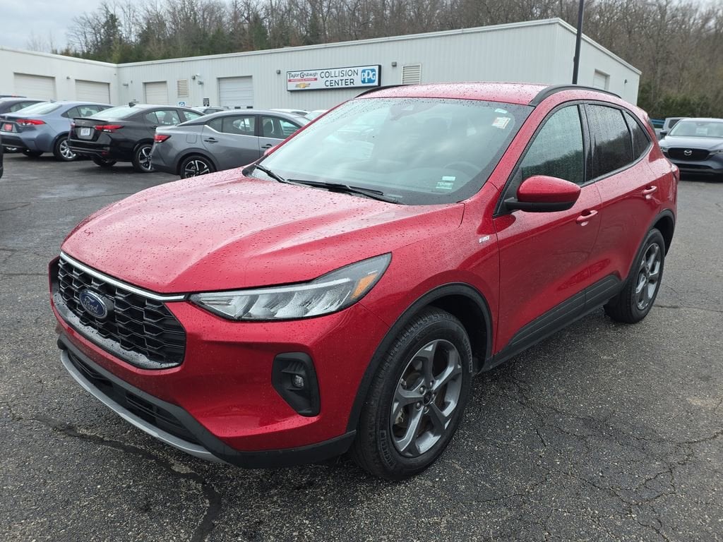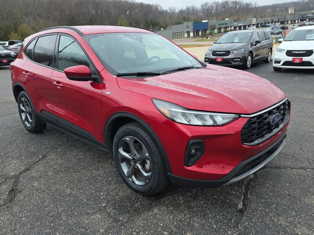 Bluetooth, Rear Camera, One Owner, No Accident, Escape ST-Line Select, 4D Sport Utility, EcoBoost 2.0L I4 GTDi DOHC Turbocharged VCT, 8-Speed Automatic, AWD, Red Metallic, Ebony, Equipment Group 401A, 2.91 Axle Ratio, 4-Wheel Disc Brakes, 6 Speakers, ABS brakes, Air Conditioning, Alloy wheels, AM/FM radio: SiriusXM, AM/FM Stereo, Auto High-beam Headlights, Automatic temperature control, Brake assist, Bumpers: body-color, Compass, Delay-off headlights, Driver door bin, Driver vanity mirror, Dual front impact airbags, Dual front side impact airbags, Electronic Fuel Door Release, Electronic Stability Control, Emergency communication system: SYNC 4 911 Assist, FordPass Connect, Four wheel independent suspension, Front anti-roll bar, Front Bucket Seats, Front Center Armrest, Front dual zone A/C, Front fog lights, Front reading lights, Fully automatic headlights, Heated door mirrors, Heated front seats, Heated steering wheel, Heated Vinyl/Cloth Front Sport Contour Bucket Seats, Illuminated entry, Internet access capable: FordPass Connect 4G, Knee airbag, Low tire pressure warning, Neutral Towing Capability, Occupant sensing airbag, Outside temperature display, Overhead airbag, Overhead console, Panic alarm, Passenger door bin, Passenger vanity mirror, Pedestrian Alert Sounder, Power door mirrors, Power driver seat, Power Liftgate, Power steering, Power windows, Radio data system, Rear anti-roll bar, Rear reading lights, Rear seat center armrest, Rear window defroster, Rear window wiper, Remote keyless entry, Speed control, Speed-sensing steering, Speed-Sensitive Wipers, Split folding rear seat, Spoiler, Sport steering wheel, Steering wheel mounted audio controls, SYNC 4, Tachometer, Telescoping steering wheel, Tilt steering wheel, Traction control, Trip computer, Variably intermittent wipers, Wheels: 18 Rock Metallic Painted Aluminum, Escape ST-Line Select, 4D Sport Utility, EcoBoost 2.0L I4 GTDi DOHC Turbocharged VCT, 8-Speed Automatic, AWD, Red Metallic, Ebony, Equipment Group 401A. Red Metallic 2025 Ford Escape ST-Line Select EcoBoost 2.0L I4 GTDi DOHC Turbocharged VCT 8-Speed Automatic AWD 4D Sport Utility
