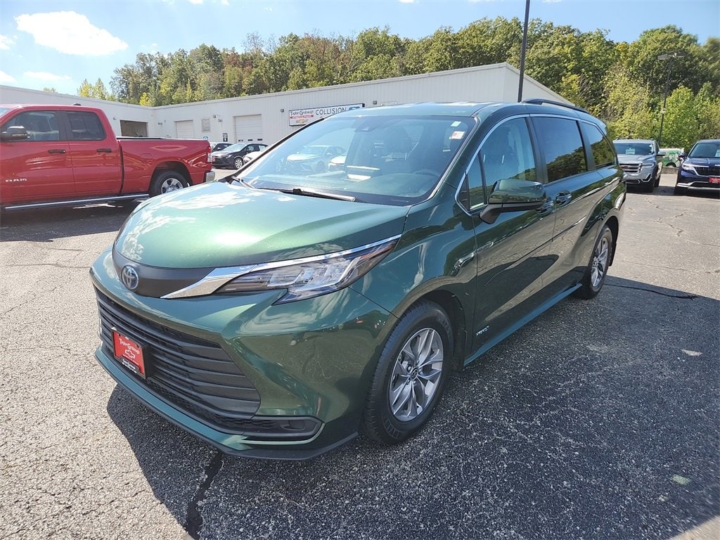 17 Alloy Wheels, 3rd row seats: split-bench, 4-Wheel Disc Brakes, 6 Speakers, ABS brakes, Air Conditioning, Alloy wheels, AM/FM radio: SiriusXM, Apple CarPlay/Android Auto, Auto High-beam Headlights, Auto-dimming door mirrors, Automatic temperature control, Axle Ratio: TBA, Brake assist, Bumpers: body-color, Compass, Delay-off headlights, Door auto-latch, Driver door bin, Driver vanity mirror, Driver's Seat Mounted Armrest, Dual front impact airbags, Dual front side impact airbags, Electronic Stability Control, Emergency communication system: Safety Connect with 1-year trial, Exterior Parking Camera Rear, Fabric Seat Material, Four wheel independent suspension, Front anti-roll bar, Front Bucket Seats, Front dual zone A/C, Front reading lights, Fully automatic headlights, Heated door mirrors, Illuminated entry, Knee airbag, Lane Departure Warning System, Low tire pressure warning, Occupant sensing airbag, Outside temperature display, Overhead airbag, Overhead console, Panic alarm, Passenger door bin, Passenger seat mounted armrest, Passenger vanity mirror, Power door mirrors, Power driver seat, Power steering, Power windows, Radio data system, Radio: Audio, Rear air conditioning, Rear anti-roll bar, Rear reading lights, Rear seat center armrest, Rear side impact airbag, Rear window defroster, Rear window wiper, Reclining 3rd row seat, Remote keyless entry, Speed control, Speed-sensing steering, Split folding rear seat, Spoiler, Steering wheel mounted audio controls, Tachometer, Telescoping steering wheel, Tilt steering wheel, Traction control, Trip computer, Turn signal indicator mirrors, Variably intermittent wipers. Green 2021 Toyota Sienna LE 8 Passenger 2.5L I4 CVT FWD 4D Passenger Van